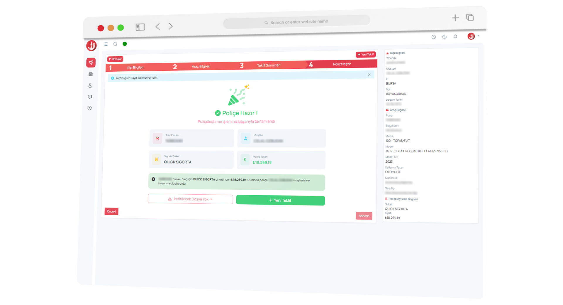 Detaylı Bilgi AlTeklifler arasından poliçeleştirilmek istenen şirket seçildikten sonra, güvenli ödeme altyapısı üzerinden kart bilgileri hızlıca tamamlanarak poliçe kesim süreci anında ve sorunsuz bir şekilde sonuçlandırılır.